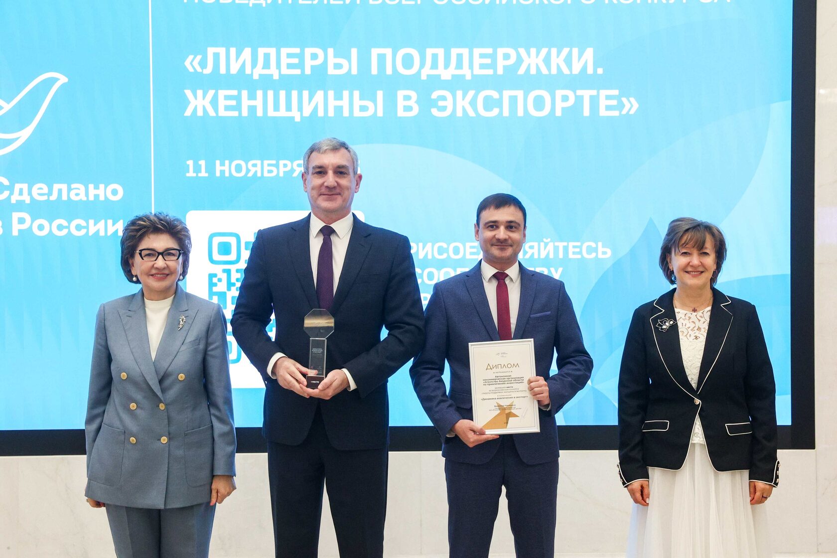 В номинации «Динамика вовлечения в экспорт» мы заняли 1-е место за наибольшую долю женщин-предпринимателей среди получателей государственной поддержки — 47%.